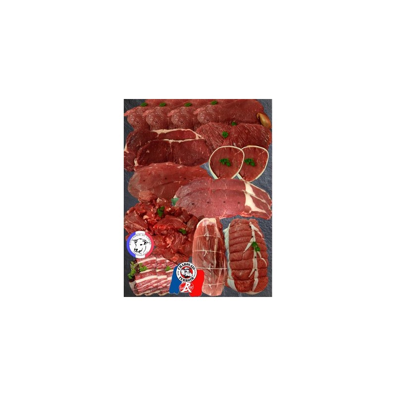 2 Tournedos Filet (2x150gr) 2 Faux Filet (2x200gr) 2 Entrecôte (2x200gr) 2 Bavette Aloyau (2x200gr) 6 Steack Tranche (6x180gr) 6 Steack Gite (6x180gr) Pièce à Fondue 800gr 1 Rosbeef Rumsteck (1.000kg) 1 Jarret de Boeuf Sans os (1.000kg) Bourguignon (1.500kg) Plat de côte avec os (1.000kg)