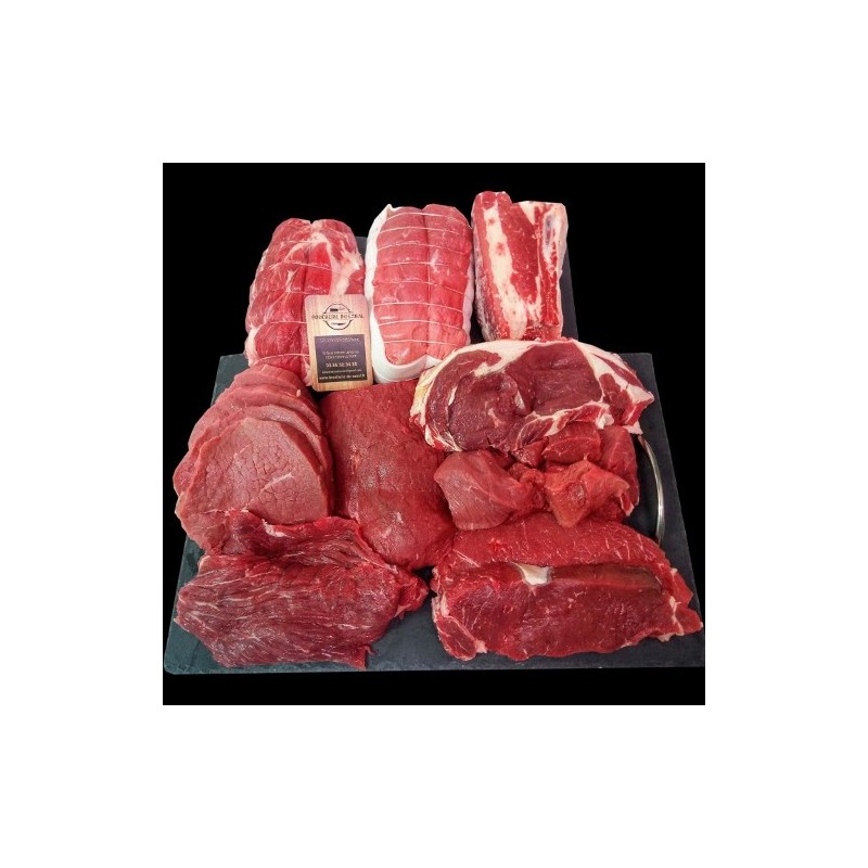 2 Faux Filet (2x300gr) 2 Entrcôte(2x300gr) 2 Bavette Aloyau (2x200gr) 4 Steack Tranche (4x180gr) 1Pièce à Fondue700gr 1 Rosbeef Tranche (1.000kg) 1 Jarret de Boeuf Sans os (1.000kg) 1Bourguignon (1.000kg) 1 Plat de Côte avec Os (1.000Kg)